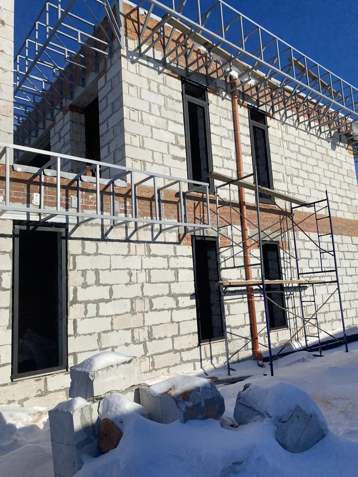 Мы активно работаем на крутом коттедже в поселке Западный. Дом будет выполнен в современном стиле, и уже сейчас можно понять, что он будет очень красив.